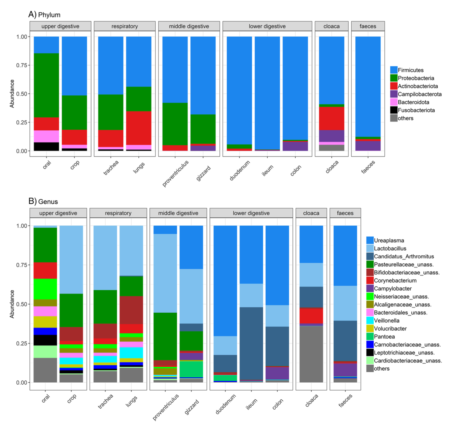 Studi su psittaciformi (es. kakapo) e su altri uccelli nidicoli dimostrano che i pulli allevati a mano sviluppano un microbiota: